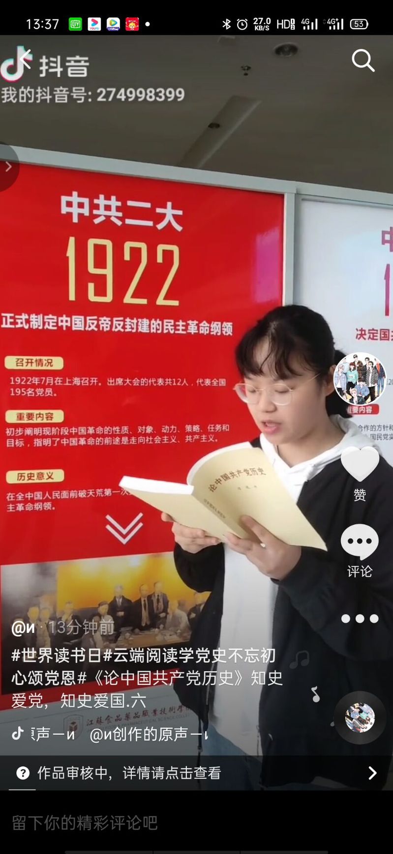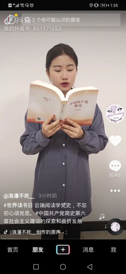 参与活动的同学们首先进行了集中学习,随后拍摄自己阅读有关党史的书籍的视频,选取片段朗读进行分享进而制作短视频上传至抖音APP@集团官方抖音号。活动发布便引起了许多同学的关注,激发了同学们的读书兴趣,同学们纷纷搜索阅读相关书籍且欢欣踊跃地加入到制作短视频的行列中。