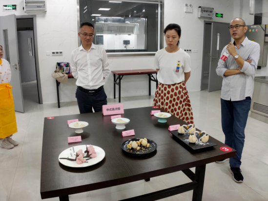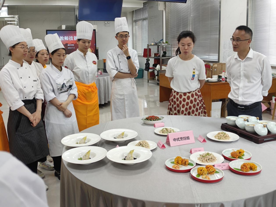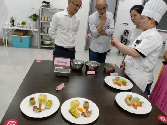 赛后,青年教师们一一向评委们介绍了自选菜肴的创意来源和设计思路。评委们分别从现场操作规范、基本功菜肴质量、自选菜肴的创新性和实用性等方面分别对五个项目进行了点评。