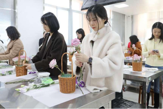 本次“三八女神节”花艺制作活动由酒店管理与数字化运营专业团队承办,张丽老师主持。董秀芳老师为各位女神们讲授中西方基本插花知识,带领大家对花艺理论知识进行了学习了解,包括插花的特点和基本分类、制作方法等。随后在动手制作花篮时,女神们大胆发挥想象,用灵巧的双手,将多种花材修剪、整枝,再根据不同的花艺特点、色彩、形状有层次地搭配在一起。酒店团队的专业教师和员工志愿者们随时对女神们的花艺制作进行帮助和指导。活动中,各位女神们神采飞扬,灵感迸发,设计出了一篮篮各具特色的插花作品,值此节日送给自己,意义非凡,也增添了浓厚温馨的节日气氛。