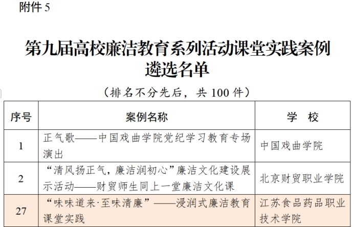 近日,教育部办公厅公布了第九届高校廉洁教育系列活动结果,酒店公司党总支报送的《“味味道来·至味清廉”——浸润式廉洁教育课堂实践》案例入选教育部廉洁教育系列活动课堂实践案例。全国共100件作品入选,江苏省仅1家高职校入选。