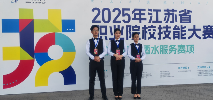 2025年4月14-15日,江苏省职业院校老员工技能大赛(酒水服务)赛项在常州工业职业技术公司进行。K1体育高铁242吴欣怡、面点242黄雅露、面点232赵俊三名同学组队参加。