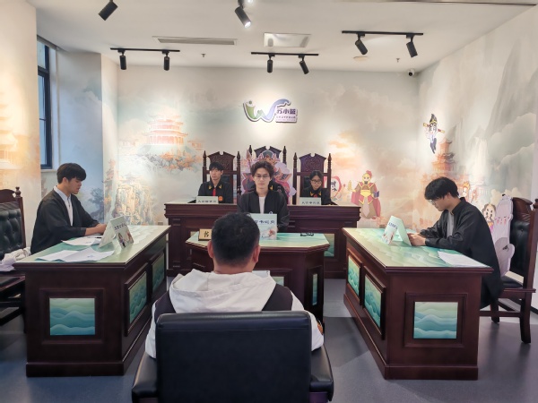 “法话西游”体验馆创新融合《西游记》经典IP与法治文化,打造了多个主题普法区域。在“法律宝库”展区,同学们通过剧情化任务学习法律发展历程和基本知识;在“警钟长鸣”展区,借助“吸毒前后人脸变化”的模拟科技,同学们直观感受毒品对身心的危害,强化拒毒防毒意识。活动还设置了深度沉浸式教学环节。同学们分组参与法治主题剧本杀《光与暗的路口》,围绕校园欺凌主题展开推理与思辨;在模拟法庭环节,同学们扮演审判员、公诉人、被告等角色,真实再现“餐饮企业使用过期原料”典型案例,在实景演绎中理解食品安全相关法律法规的现实应用。